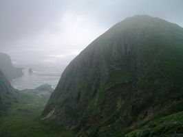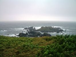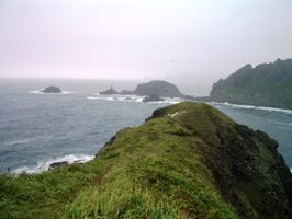 【右】 天気が少し回復した礼文島。桃岩の先に霞んだ猫岩が幻想的だ