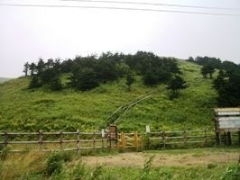 パックツアーの観光バスは必ず澄海岬をとおるので西上泊へ向かう道はとてもきれいに整備されている。滅多に人なんか歩かないだろうところにも広い歩道がある。そのような道をとぼとぼ歩いていると、物々しい柵で囲まれた丘を発見、なんでも「レブンアツモリソウ群生地」ということだが、残念ながら花は6月が見頃で8月の今は花はない。この群生地周辺は保護活動にかなり力を入れているらしく、周囲の数箇所に監視カメラ、そして監視小屋まであった。聞くところによると、盗掘が後を絶たないらしい。大事な花だ、礼文島は国立公園内にあるので草木を採ることは無論処罰の対象だ。心しておきたい。